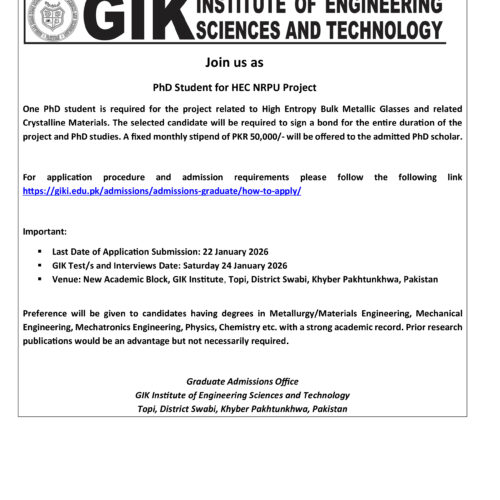 PhD Student for Pakistan Science Foundation Project