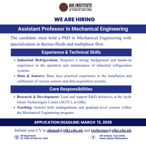 Applications Invited for the Position of Assistant Professor in Mechanical Engineering