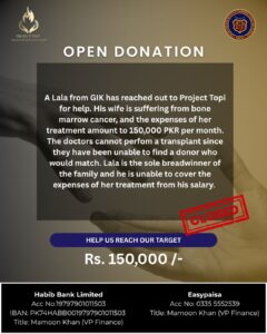 Project Topi successfully organized an open donation drive to support the treatment of a poor worker’s wife who was suffering from bone marrow cancer. This initiative mobilized the GIKI community to come together in compassion, raising essential funds that enabled her to access critical medical care. By facilitating timely financial assistance, the campaign helped ease the burden of high treatment costs and ensured that she received the support needed during a life-threatening health crisis.
