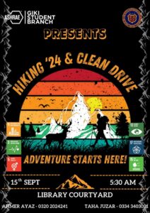 The American Society of Heating, Refrigerating, and Air Conditioning Engineers (ASHRAE), under the Department of Student Affairs, organized a Hiking and Clean Drive at GIKI on 15th September 2024. The event combined outdoor recreation with environmental responsibility, as participants enjoyed a scenic hike while actively cleaning up the surrounding areas. It promoted physical well-being, teamwork, and awareness about preserving natural habitats.